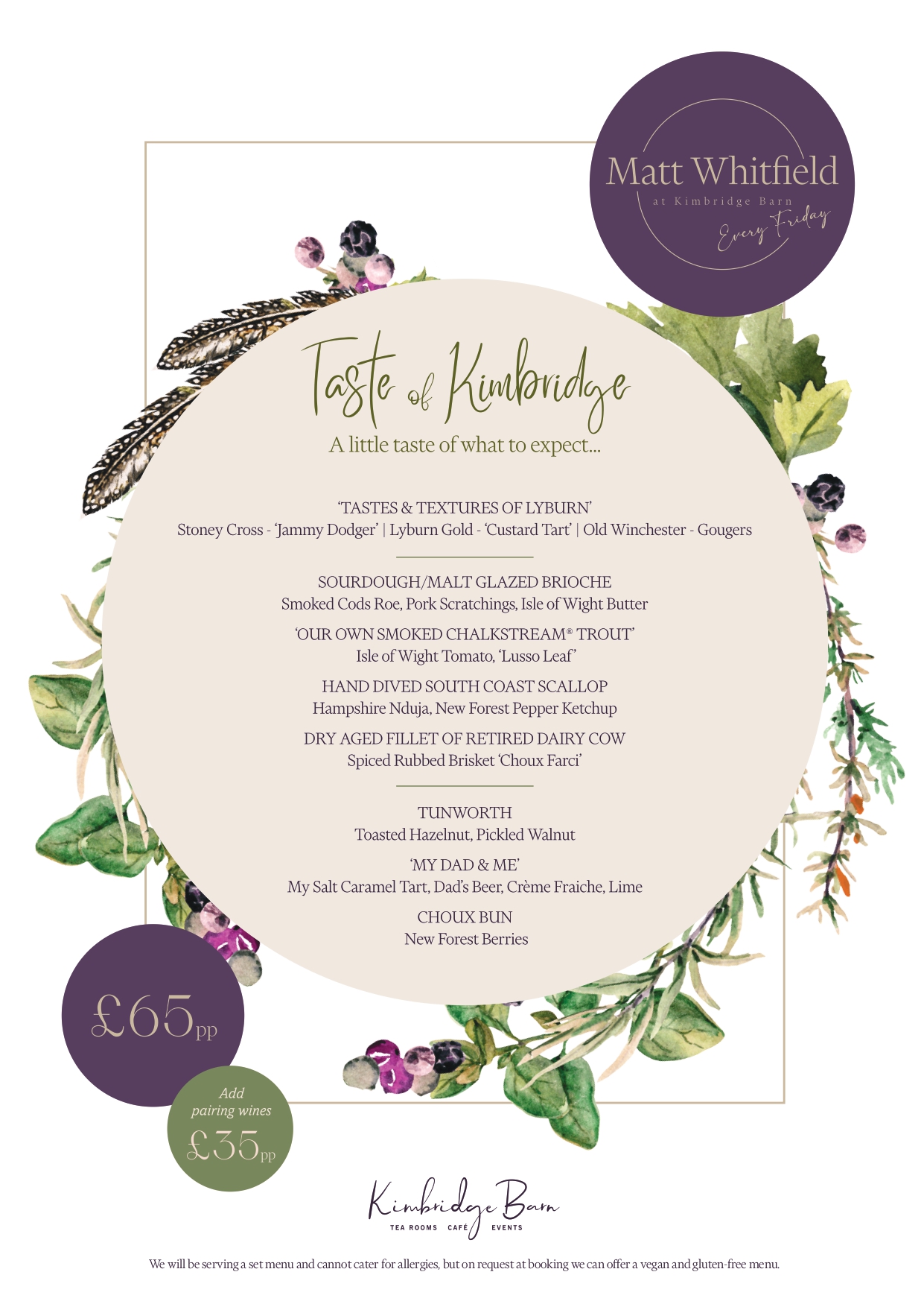 Enjoy a Taste of Kimbridge where we’ll be serving a set menu of between 7 and 12 courses.  Your table is yours for the evening, so there’s no rush, just relax and enjoy.
