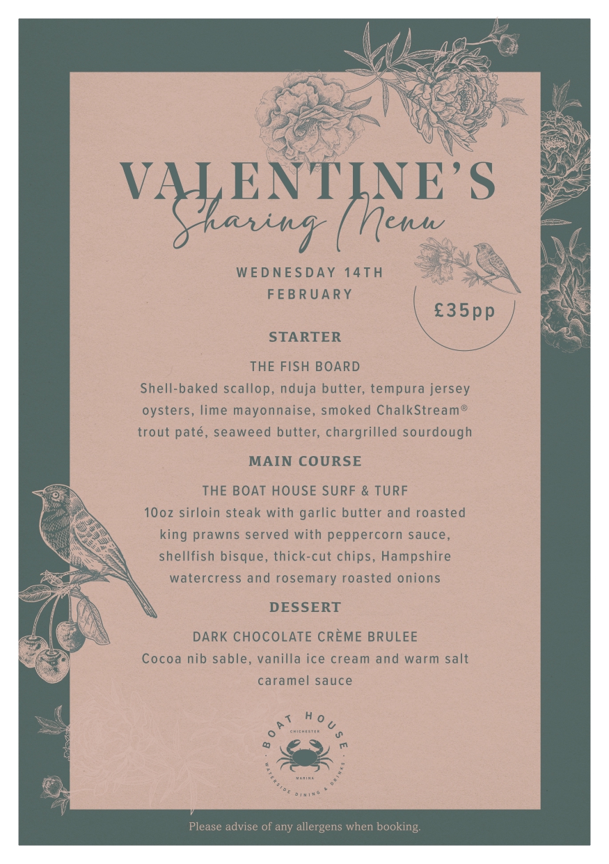 Love is sweeter when shared, and we’ve curated the perfect experience for you and your special someone. Our chefs will be serving up sumptuous sharing boards on Valentine’s Day evening, alongside our usual menu, featuring a delightful selection of fresh seafood and succulent steak, finished off with a decadent dark chocolate crème brûlée.