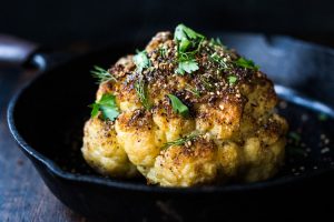 Harissa roasted half cauliflower, sweet potato puree, tahini and lemon yogurt, crispy onions, coriander (s)
