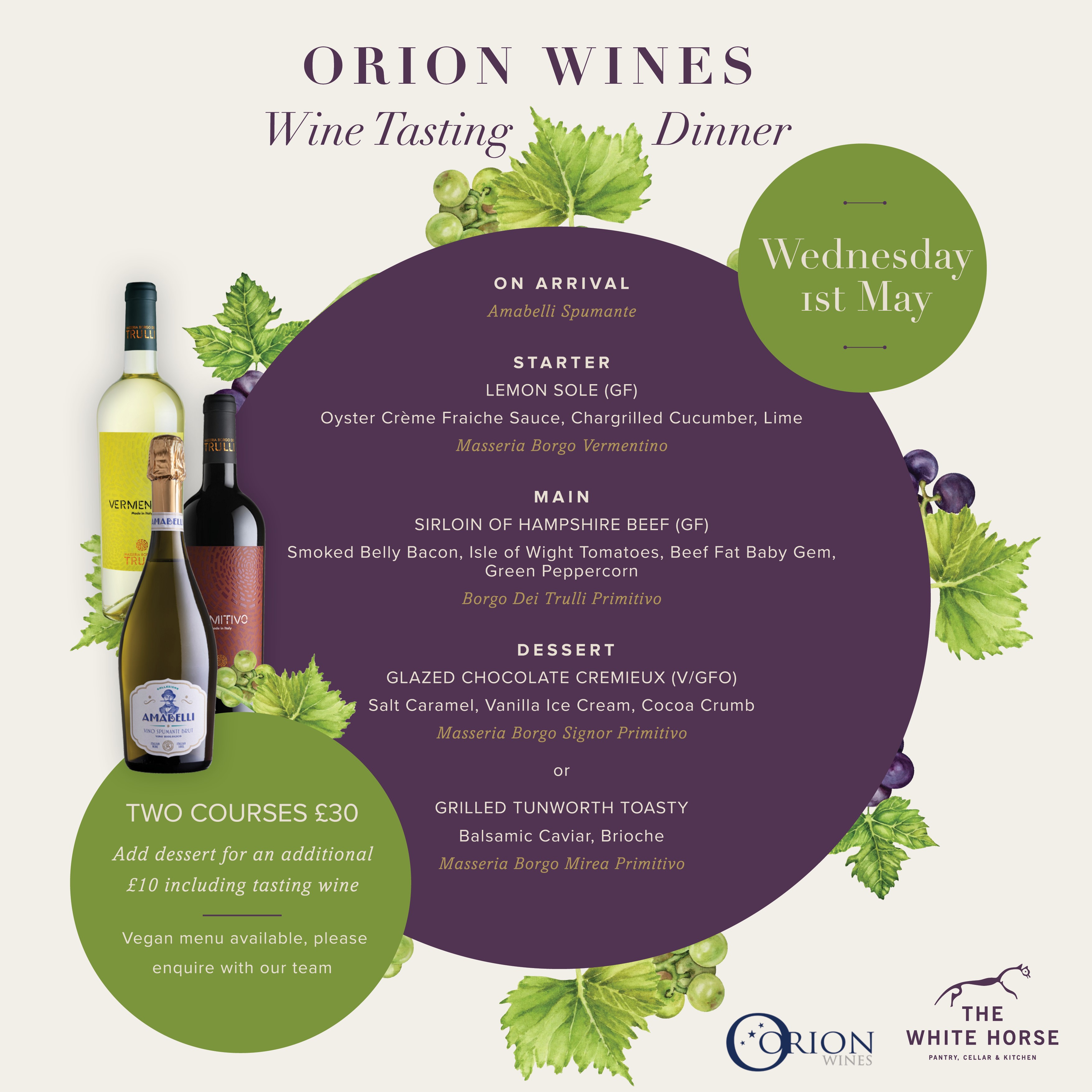 We are delighted to invite you to an exclusive evening at The White Horse, where we’re partnering with one of Italy’s most intriguing, innovative and delicious wine producers, Orion Wines for a Wine Tasting Dinner that promises to elevate your senses and transport you to the lush vineyards of Italy.