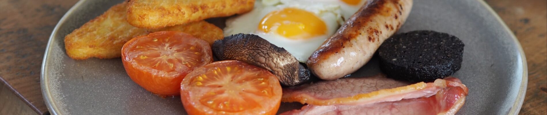 £14Pork sausage, streaky bacon, flat mushroom, roasted tomato, hash brown, baked beans, fried eggs, toast - add black pudding £2
